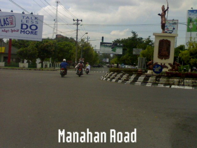 Manahan is an area with big road. There are two statues of a man is using an arrow on its bow. The statue is pulling the bow and ready to shoot the arrow.